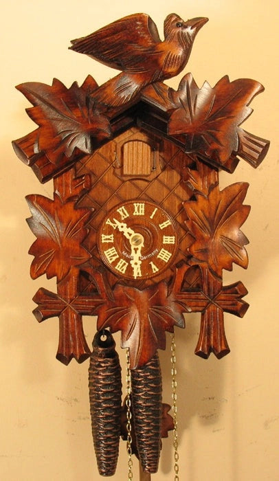 This charming and inexpensive cuckoo clock has leaves and a bird that is hand-carved from solid Linden wood. When the clock strikes the hour or half-hour, the door opens, and a cuckoo appears and calls along with the clock’s gong strike.